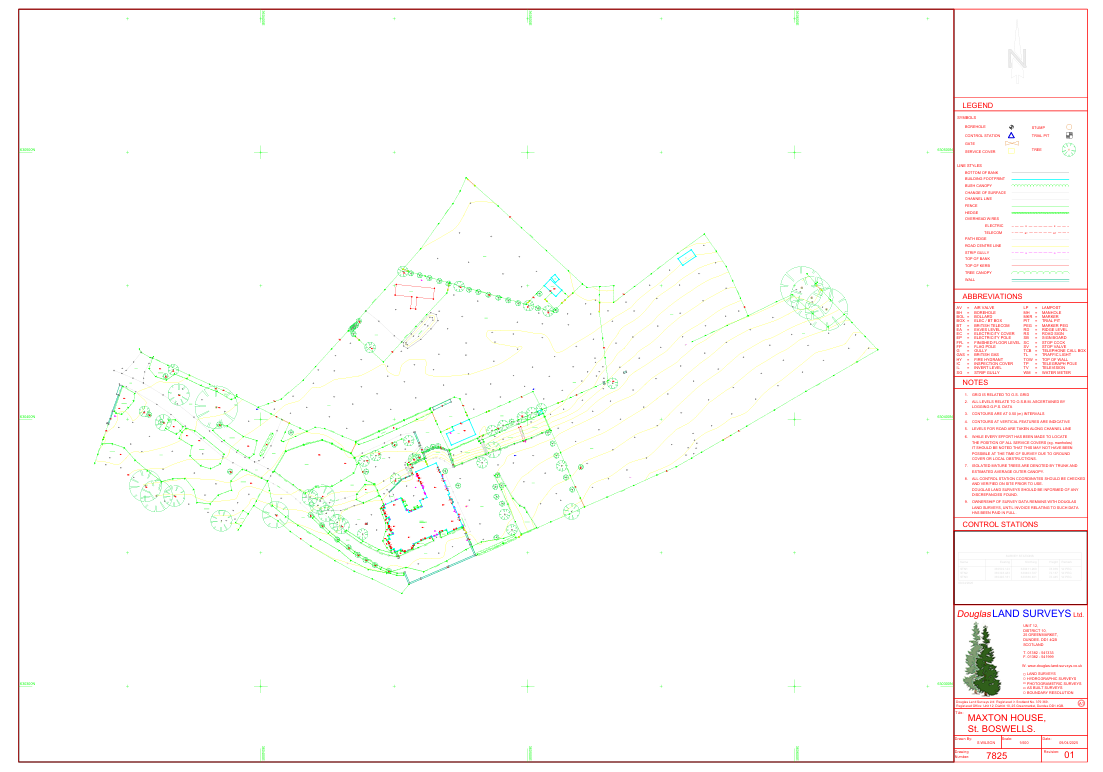 The site survey records existing features, including buildings, trees, changes in level, soil types and climatic factors, and will form the basis of the design. Where necessary, a professional surveyor will be used in discussion with the client.